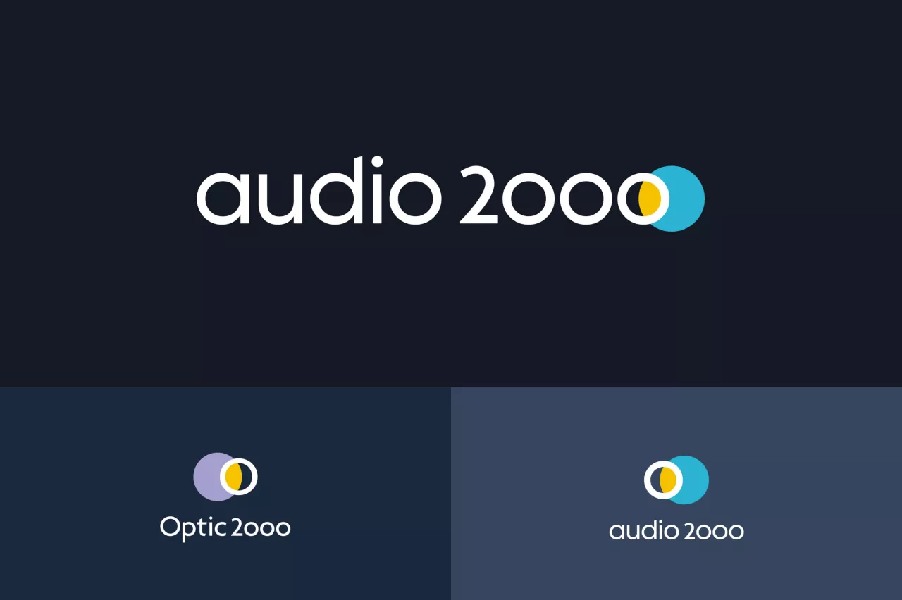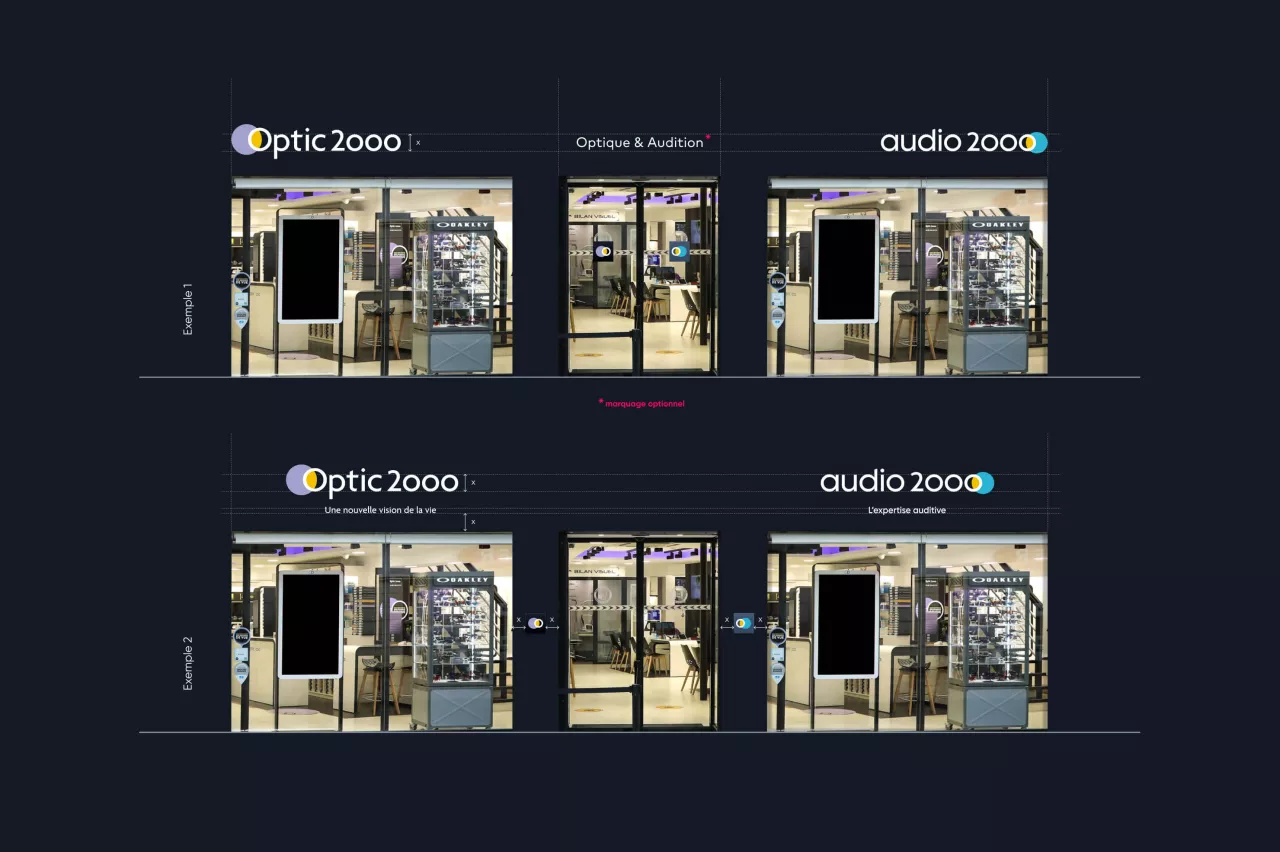 Une symétrie de construction autour des o entre celui qui démarre "Optic" et celui qui termine "Audio" pour rapprocher les deux entités et les faire communiquer en capitalisant sur la symbolique forte du monogramme, iconique de la marque Optic 2000.