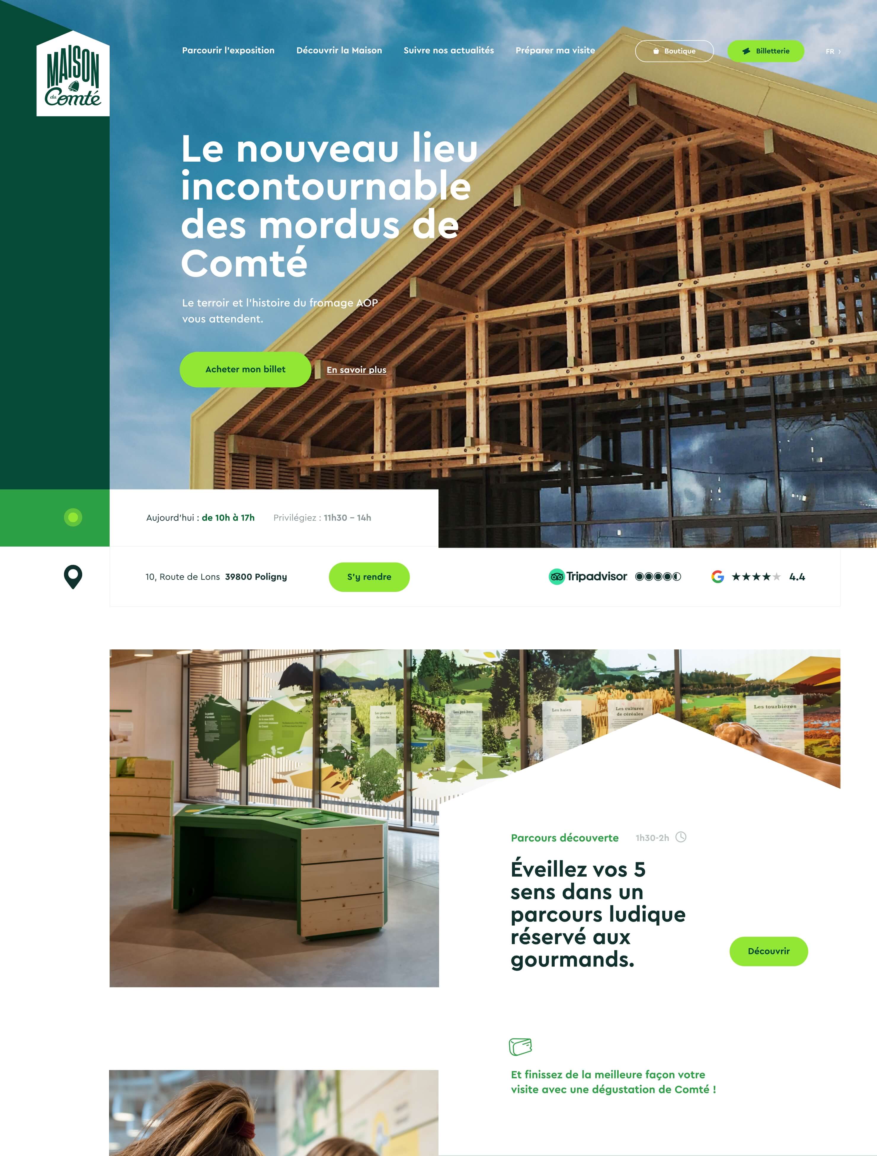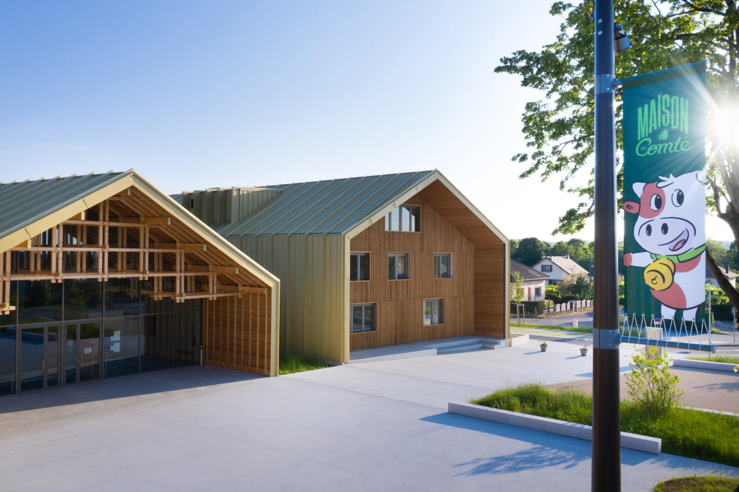 La nouvelle identité de la Maison du Comté, basée à Poligny dans le Jura, trouve sa source dans l’architecture même du bâtiment : 3 maisons aux toits pentus caractéristiques de la région. La clochette, élément iconique de la marque, permet de faire la filiation avec Comté.
